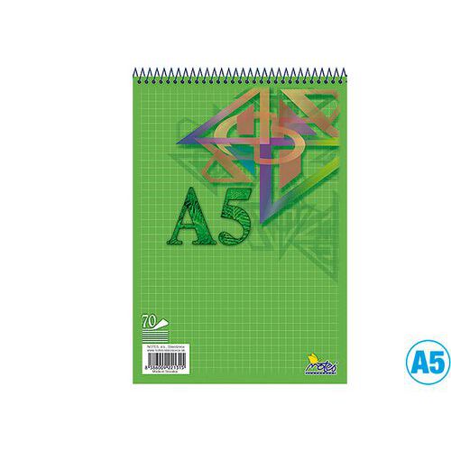 spiralovy blok z bezdreveho papiru, spirala na kratsi strane, podlepeny sedou lepenkou.