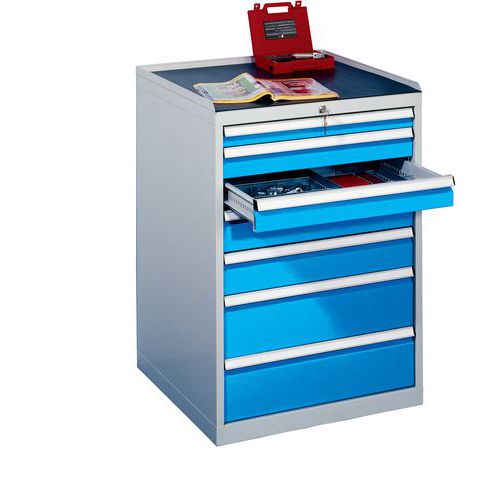 Kovové dílenské skříně s policemi pro efektivní využití v provozech a dílnách.