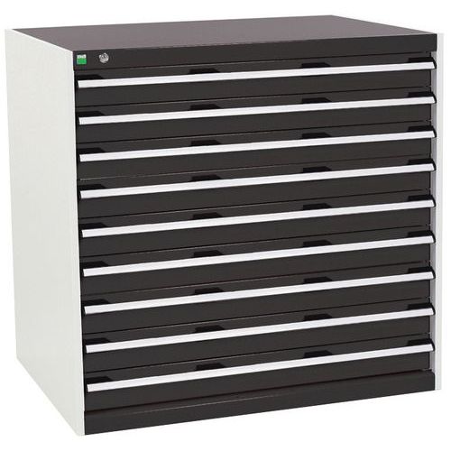 Zásuvkové skříně Bott Cubio se zásuvkami s nosností 75 kg a 100% výsuvy na válečkových ložiskách.