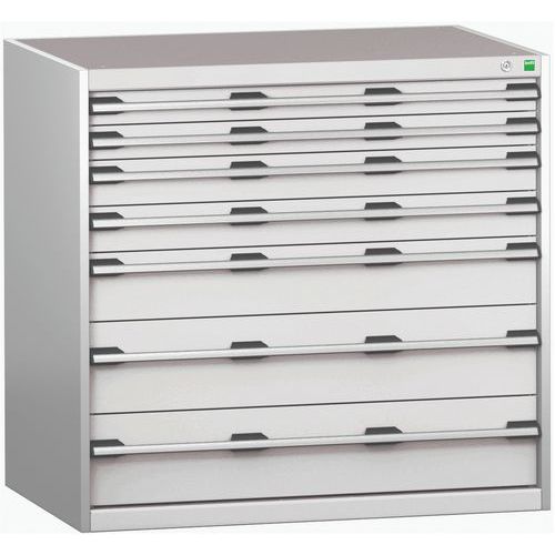 Zásuvkové skříně Bott Cubio se zásuvkami s nosností 75 kg a 100% výsuvy na válečkových ložiskách.