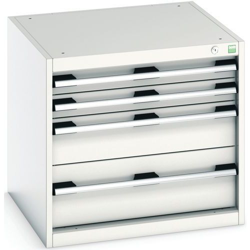 Zásuvkové skříně Bott Cubio se zásuvkami s nosností 75 kg a 100% výsuvy na válečkových ložiskách.