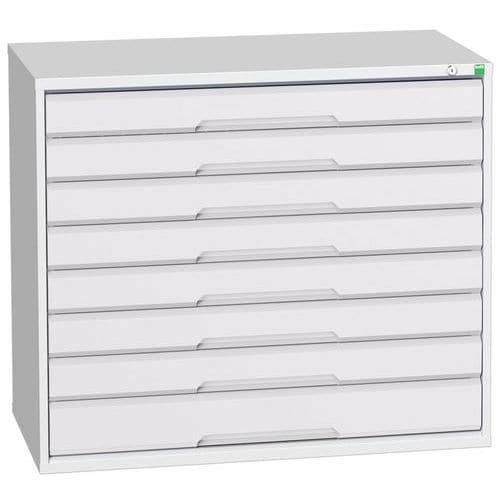 Zásuvkové skříně Bott Cubio se zásuvkami s nosností 75 kg a 100% výsuvy na válečkových ložiskách.