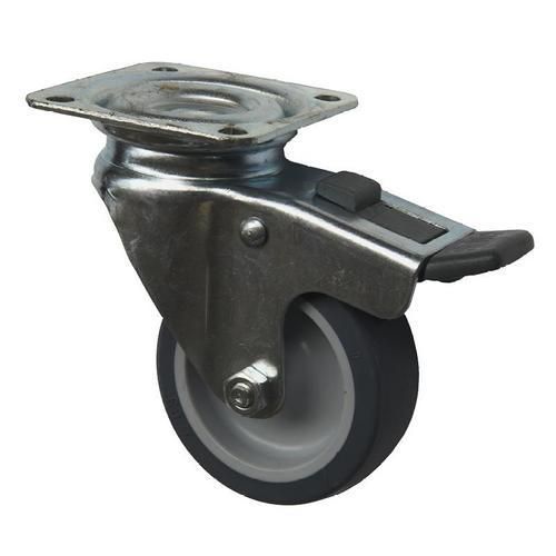 Otočná pryžová přístrojová kola s brzdou. Nešpinivá, nízký valivý odpor. Kryt proti namotávání vláken.