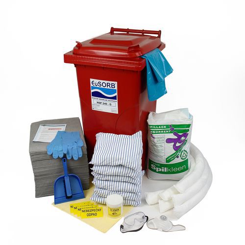 Mobilní plastová popelnice (240 l) obsahuje sadu chemických sorbentů s příslušenstvím pro rychlou likvidaci uniklých kapalin.