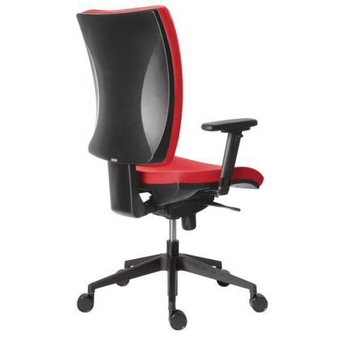 Kancelářská židle s vysokým polstrovaným opěradlem, které lze aretovat v přední i zadní poloze.
