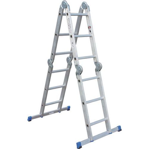 Kloubový hliníkový žebřík ze čtyř dílů po třech příčkách, vhodný pro profesionální použití.