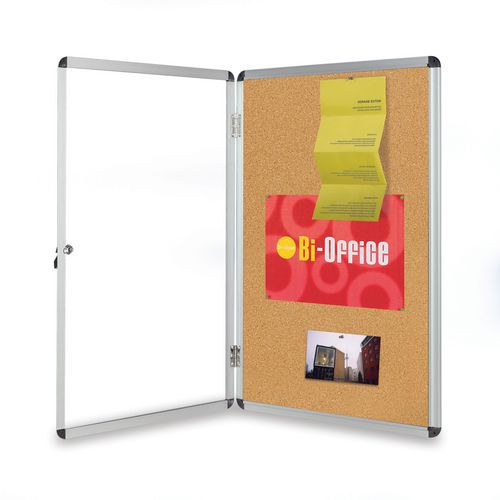 Korková vitrína s oválným hliníkovým rámem vhodná do vnitřního prostředí.