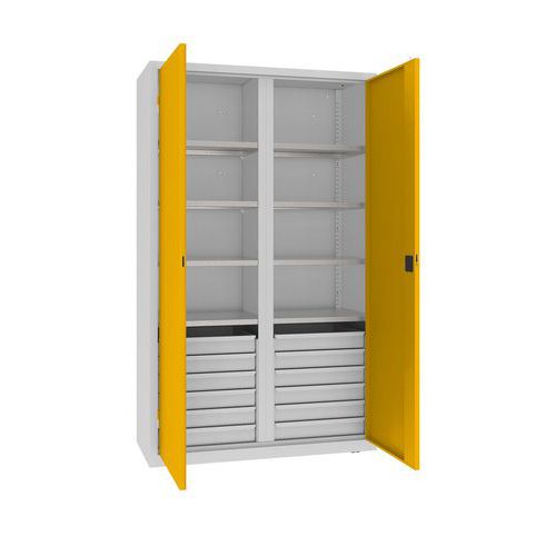 Vysoké dílenské skříně se zásuvkami vhodné pro ukládání dílenského vybavení a materiálu.