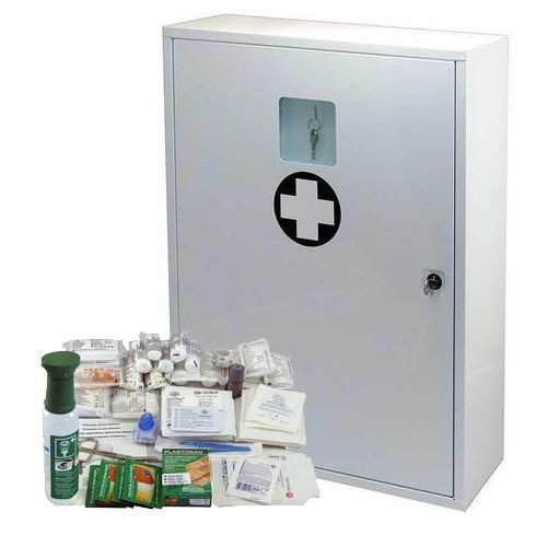 Hliníková lékárnička na stěnu vhodná do kancelářských, dílénských nebo průmysových prostorů.