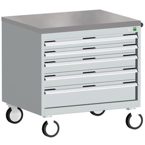 Mobilní zásuvkové skříně Bott Cubio s horní pracovní plochou tloušťky 2 cm typu multiplex/linoleum nebo ohraněný plech s rohoží.