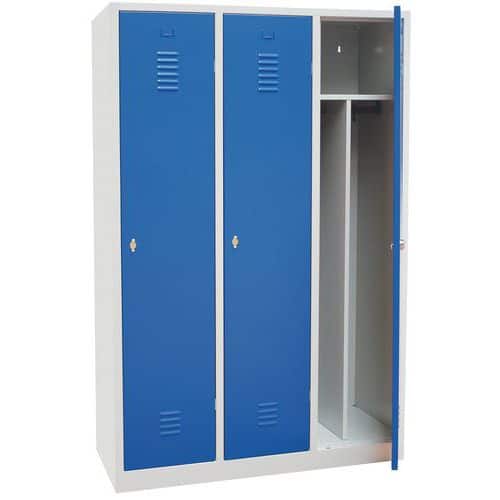 Svařovaná šatní skříň Vinco s mezistěnou, 3 oddíly, 400 mm, otočný uzávěr, šedá/modrá