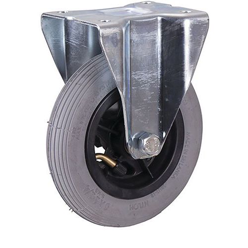 Pevná pneumatická kola na ocelovém ráfku s válečkovým ložiskem.
