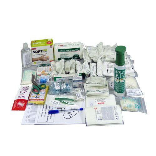 Náhradní náplň do lékárničky obsahuje základní zdravotnický a obvazový materiál pro poskytnutí první pomoci, který byl sestaven na základě rizik vyskytujících se na pracovištích v živočišné a rostlinné výrobě.balení obsahuje: 2x obvaz 7 cm x 5 m; 2x obvaz 10 cm x 5 m; 2x obvaz hotový sterilní č. 2; 3x obvaz hotový sterilní č. 3; 3x obvaz hotový sterilní č. 4; 3x obvaz elastický 10 cm x 4 m; 1x pryžové obinadlo škrtící; 2x rouška na popáleniny 40 x 60 cm sterilní; 2x sterilní krytí 5 x 5 cm; 3x sterilní krytí 7,5 x 7,5 cm; 3x sterilní krytí 10 x 10 cm; 2x oční komprese sterilní; 8x náplast s polštářkem 6 x 10 cm; 1x náplast fixační 2,5 cm x 5 m; 20x náplast s polštářkem 19 x 72 mm; 1x elastická náplast SOFT NECHT 6 x 450 cm; 1x oční výplach 0,9% NaCl - 250 ml; 1x pinzeta sterilní; 2x rouška resuscitační; 3x trojcípý šátek; 4 páry rukavice vyšetřovací; 1x digitální teploměr; 1x izotermická fólie; 1x nůžky; 1x vata obvazová 50 g; 5x desinfekční utěrka; 1x desinfekční gel - 75 ml; 12x špendlíky zavírací – nerez; 1x příručka první pomoci; 1x kniha úrazů; 1x tužka
