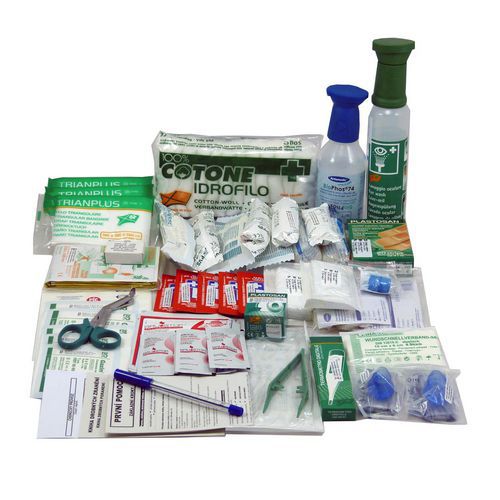 Náhradní nápl?? do lékárničky obsahuje základní zdravotnický a obvazový materiál pro poskytnutí první pomoci, který byl sestaven na základě rizik vyskytujících se v kuchyních, přípravnách jídla a v potravinářském průmyslu.balení obsahuje: 2x obvaz 7 cm x 5 m; 2x obvaz 10 cm x 5 m; 1x obvaz hotový sterilní č. 2; 3x obvaz hotový sterilní č. 3; 3x obvaz hotový sterilní č. 4; 3x obvaz elastický 10 cm x 4 m; 1x pryžové obinadlo škrtící; 2x rouška na popáleniny 40 x 60 cm sterilní; 1x obvaz BURNSHIELD 10 x 10 cm; 3x gel na popáleniny 3,5 g; 2x sterilní krytí 5 x 5 cm; 3x sterilní krytí 7,5 x 7,5 cm; 2x sterilní krytí 10 x 10 cm; 8x náplast s polštářkem 6 x 10 cm; 1x náplast fixační 2,5 cm x 5 m; 20x náplast s polštářkem 19 x 72 mm; 100x náplast s polštářkem 2 x 7 cm – detekovatelná; 1x pinzeta sterilní; 2x rouška resuscitační; 3x trojcípý šátek; 2 páry rukavice vyšetřovací; 1x digitální teploměr; 1x izotermická fólie; 1x nůžky; 1x vata obvazová 50 g; 5x desinfekční utěrka; 12x špendlíky zavírací – nerez; 1x příručka první pomoci; 1x kniha úrazů; 1x tužka