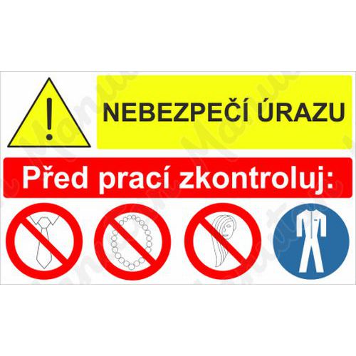 Nebezpečí úrazu před prací zkontroluj, samolepka 95 x 57 x 0,1 mm