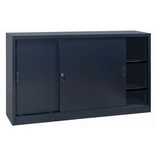 skrine se ctyrmi stavitelnymi policemi a plastovymi roletami, ktere lze plne zasunout do stran.