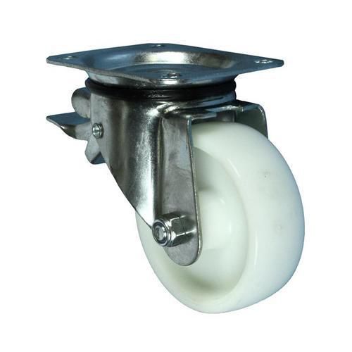 otocna kola s brzdou a obruci z bileho nylonu. kola jsou vybavena dvouradym kulickovym vencem ve vidlicove hlave.