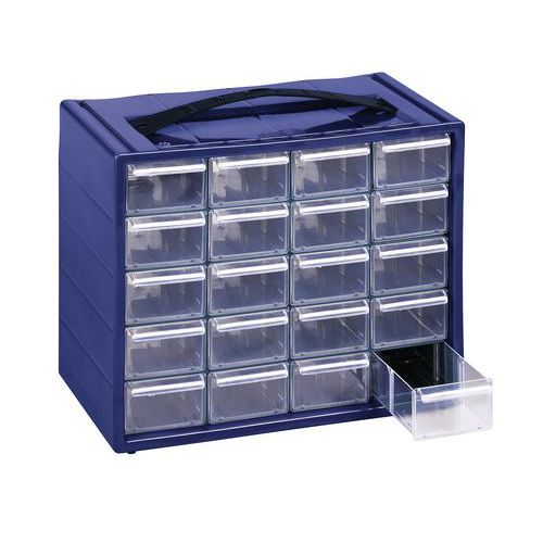 Praktická plastová skříňka s dvaceti průhlednými zásuvkami.