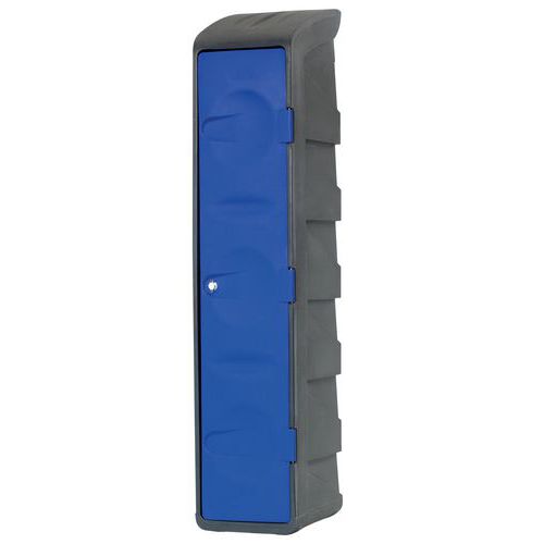 Svařovaná šatní skříň Acial, 4 oddíly, 300 mm, na nohách, otočný uzávěr, šedá/modrá