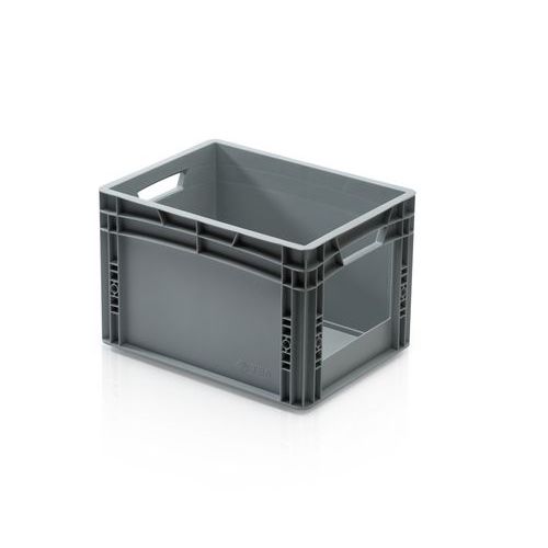 Šedé plastové přepravky vyrobené z polypropylenu copolymeru.
