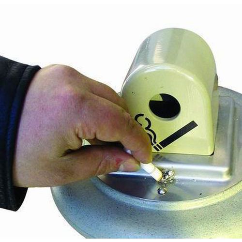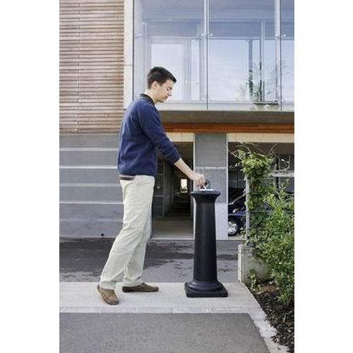 Designový sloupový popelník Rubbermaid s kovovou zhášecí plochou a vnitřní nádobou.