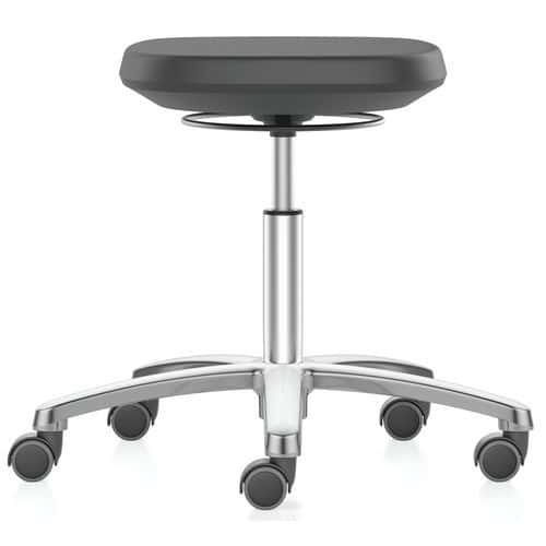 Pracovní laboratorní stolička je vybavena protiskluzovým sedákem pro pohodlné sezení. Stolička disponuje kovovou výškově nastavitelnou opěrkou na nohy. Výšku sedáku lze nastavit pomocí plynového pístu. Dobrou stabilitu zaručuje plastová základna v černé barvě s kluzáky.