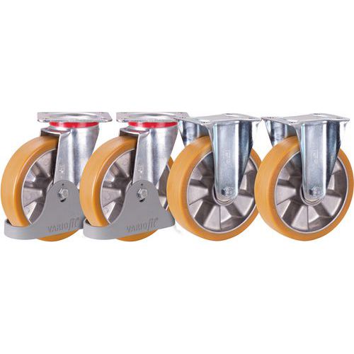Pevná pojezdová kola s červeným běhounem z polyuretanu.