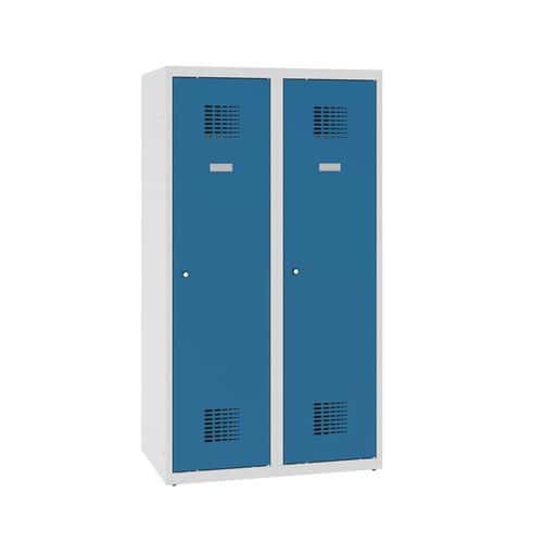 Snížená školní šatní skříň, 2 sloupce, 400 mm, šedá/modrá, cylindrický zámek