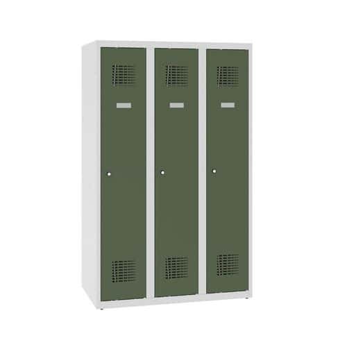 Snížená školní šatní skříň, 3 sloupce, 300 mm, šedá/zelená, tříbodový cylindrický zámek