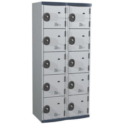 Více-oddílová šatní skříň svařovaná z ocelového plechu tloušťky 0,7 mm.