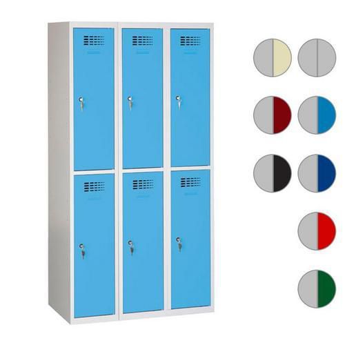 Více-oddílová šatní skříň svařovaná z ocelového plechu tloušťky 0,7 mm.