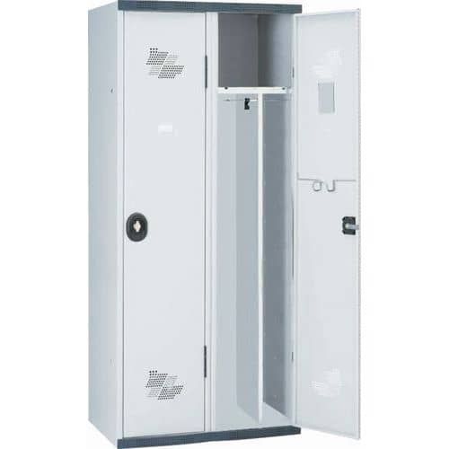 Uzamykání cylindrickým zámkem se dvěma klíči.Každý oddíl obsahuje: 1 pozinkovanou polici, 1 tyč na ramínka se 2 háčky, 1 nerozbitné magnetické zrcátko a 1 držák ručníků.