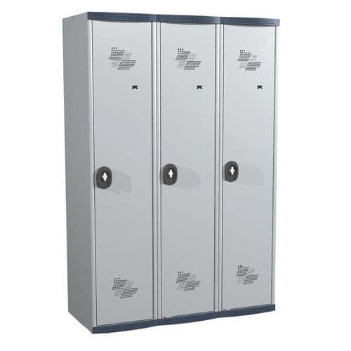 Svařovaná šatní skříň z odolného profilovaného ocelového plechu o tloušťce 0,6 mm (odpovídá 0,8 mm standardnímu).