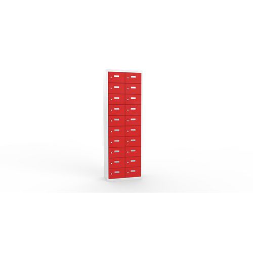 Plechová šatní skříň převážně pro základní školy. Dveře jsou celoplošně vyztužené a pevné v krutu a ohybu. Dveře jsou zavěšeny na kovových pantech originální konstrukce s úhlem otevření 180°. Police ve spodní části skříňky. Cylindrický zámek se dvěma klíči.