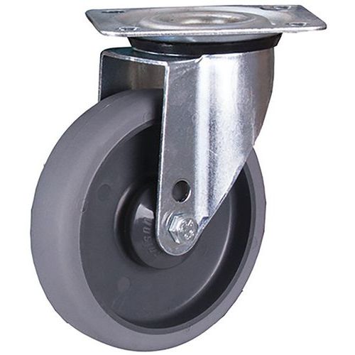 Otočná pojezdová kola z šedé termoplastické pryže na plastovém ráfku s přesnými kuličkovými ložisky.