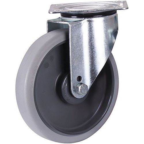 Otočná pojezdová kola z šedé termoplastické pryže na plastovém ráfku s přesnými kuličkovými ložisky.