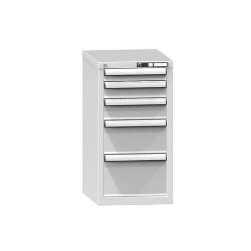 Nízké kovové skříně se dvěma policemi a zásuvkami vhodné pro profesionální použití ve vnitřních suchých a větraných prostorách.