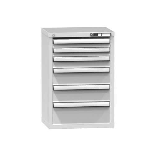 Dílenské kovové skříně se třemi zásuvkami a čtyřmi policemi vhodné pro profesionální použití ve vnitřních suchých a větraných prostorách.