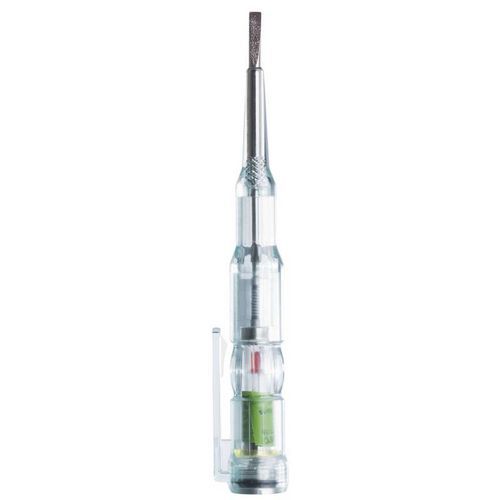 Zkoušečka napětí s optickou signalizací. Zkoušečka je určena ke zjišťování střídavého napětí 70#250 V a stejnosměrného napětí 0#250 V. Zkoušečka zjišťuje také polaritu zdrojů nebo zkrat. Zkoušečka napětí je napájena 2× LR44 (součást balení).